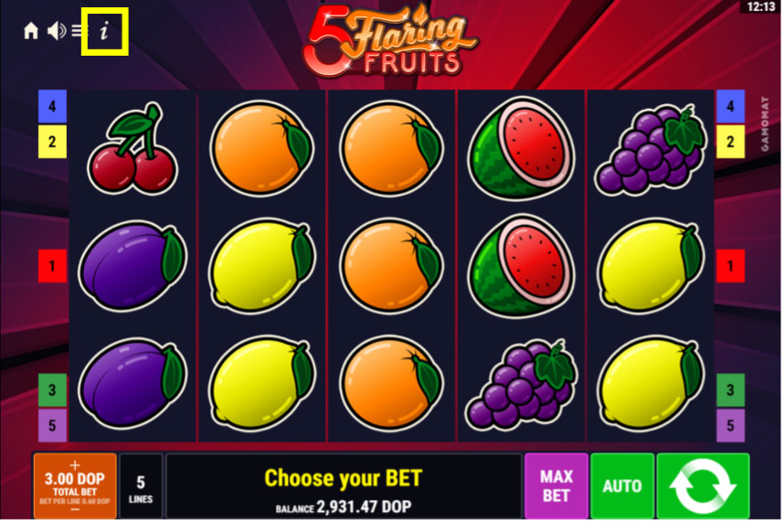 1. Entra en el juego que te interese y busca el enlace “ί” que aparece en la parte superior izquierda de la pantalla. Este enlace te mostrará la información general del juego, como el nombre, el proveedor, el tipo y la volatilidad.