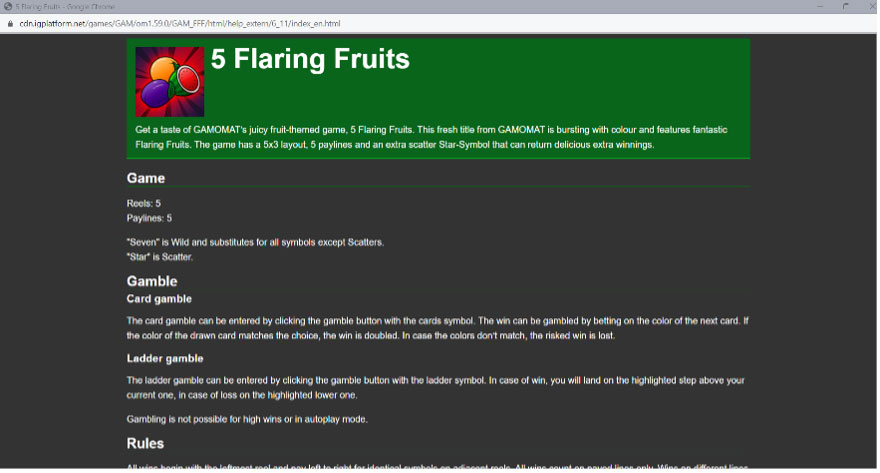 2. Al hacer clic en el enlace “ί”, se abrirá una ventana emergente con la información, detalles y reglas del juego en el idioma de tu cuenta. Aquí podrás ver las características especiales, las instrucciones del juego y las reglas.