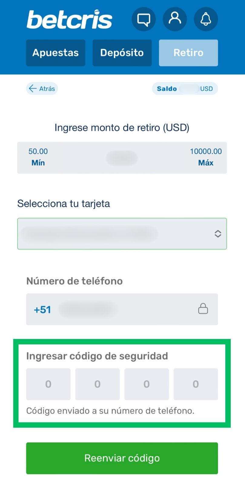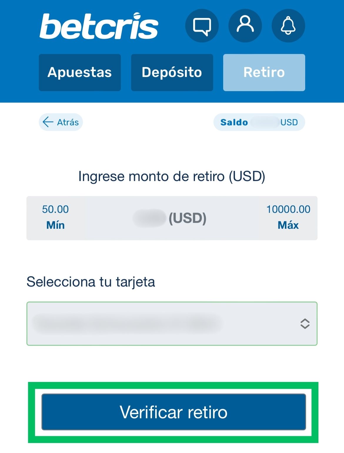 Ten en cuenta que el proceso de retiro puede tardar hasta 30 minutos en completarse. El mismo se verá reflejado en tu estado de cuenta como Betcris.